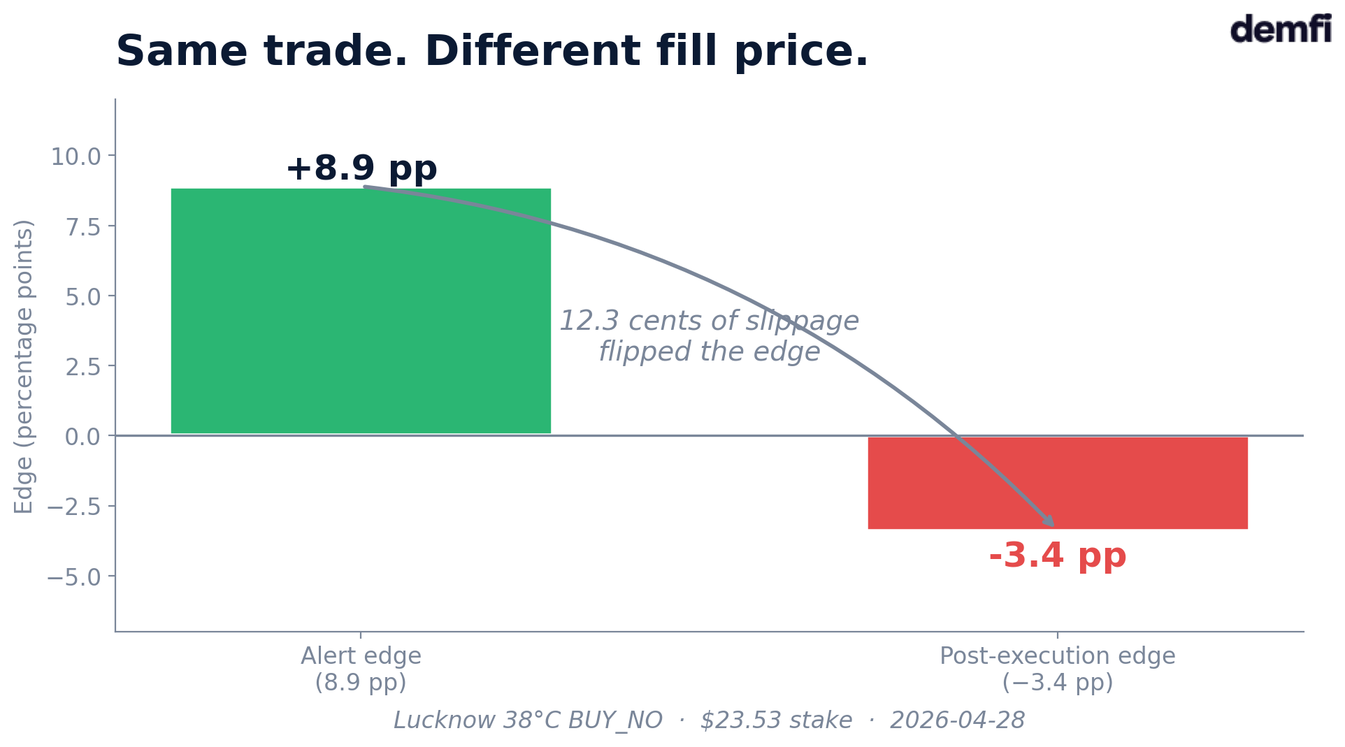 Esta mañana, nuestro bot vio una ventaja de 8,9 puntos en Lucknow. El mercado Polymarket decía: "38 °C, probablemente no, NO a 81 céntimos". Nuestro modelo decía: "más bien 90% de probabilidad de NO". Tres minutos después, el fill se ejecutó a 93 céntimos. Ventaja real a la ejecución: −3,4 puntos. Mismo trade. Mismo modelo. El mercado simplemente se tragó el margen entre la alerta y el fill.