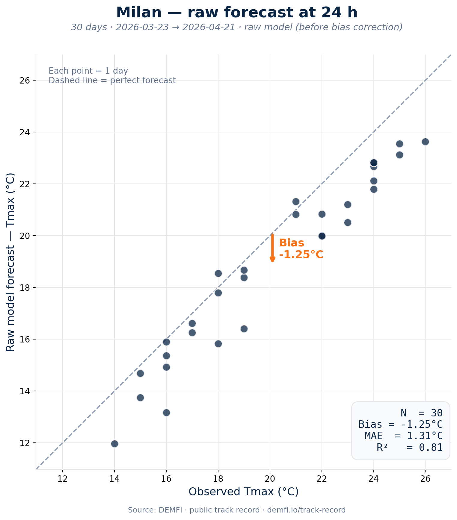 Sur une ville représentative comme Milan sur les 30 derniers jours, la prévision V1 corrigée de DEMFI atteint une erreur absolue moyenne de 0,77°C et un R² de 0,93 à 24 h d'échéance, avec un biais quasi nul. La précision varie selon la ville et le régime météo — le track-record public est disponible sur demfi.io/track-record.