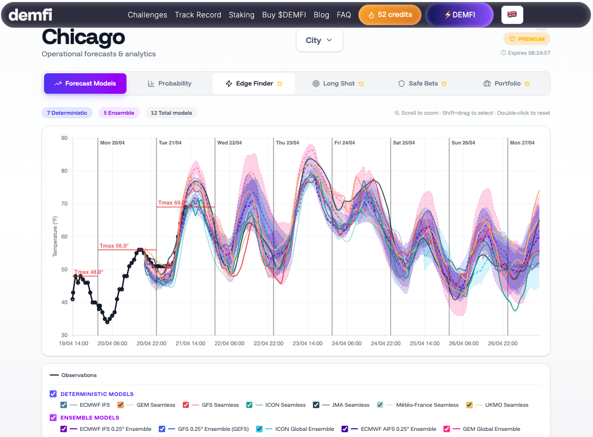 DEMFI est une plateforme d'analyse de prévisions météo pour les marchés de température Polymarket. Nous combinons 14 modèles de prévision numérique (ECMWF, GFS, ICON, JMA, etc.) avec une correction de biais en temps réel pour produire chaque jour des prévisions probabilistes sur plus de 50 villes dans le monde.